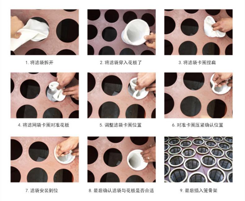 3、把新的布袋安放進(jìn)花板孔內(nèi),再把骨架放入除塵塵布袋內(nèi)卡住。